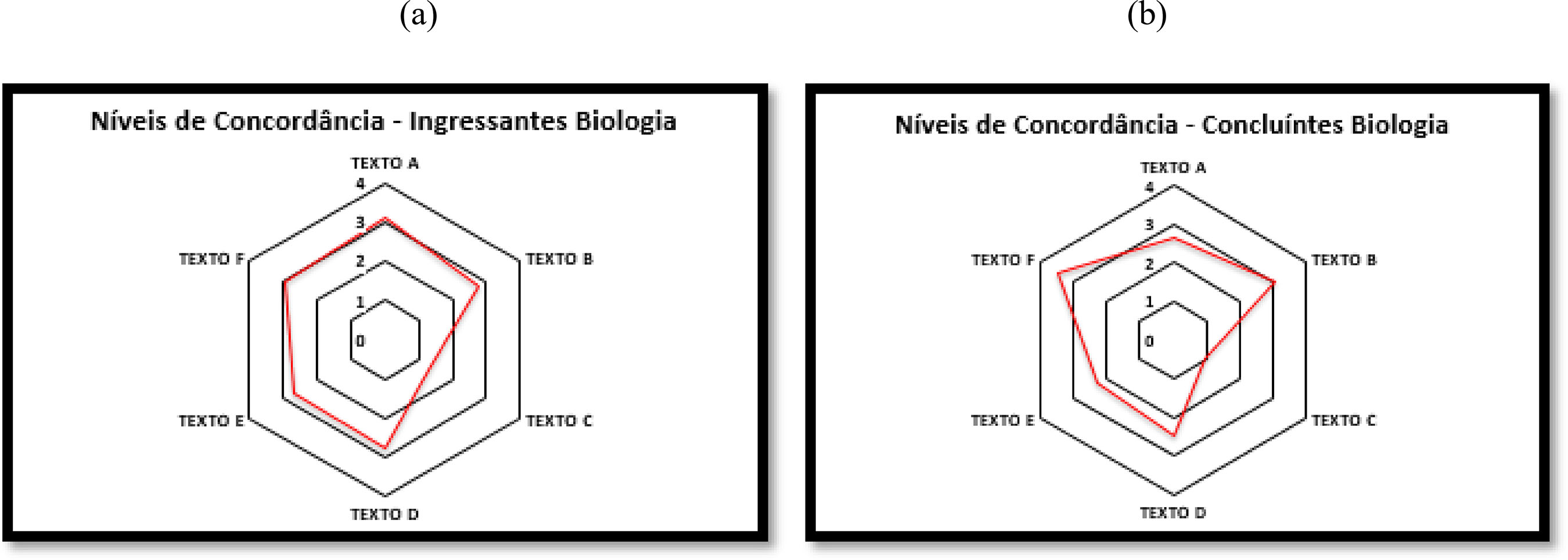 Gráfico 1 Ranking Médio dos níveis de concordância com os seis textos que constituíram o questionário aplicado aos(às) discentes ingressantes (a) e concluintes (b) do curso de Licenciatura em Ciências Biológicas: indicativos das percepções iniciais e finais dos(as) alunos(as) sobre a natureza do conhecimento científico.