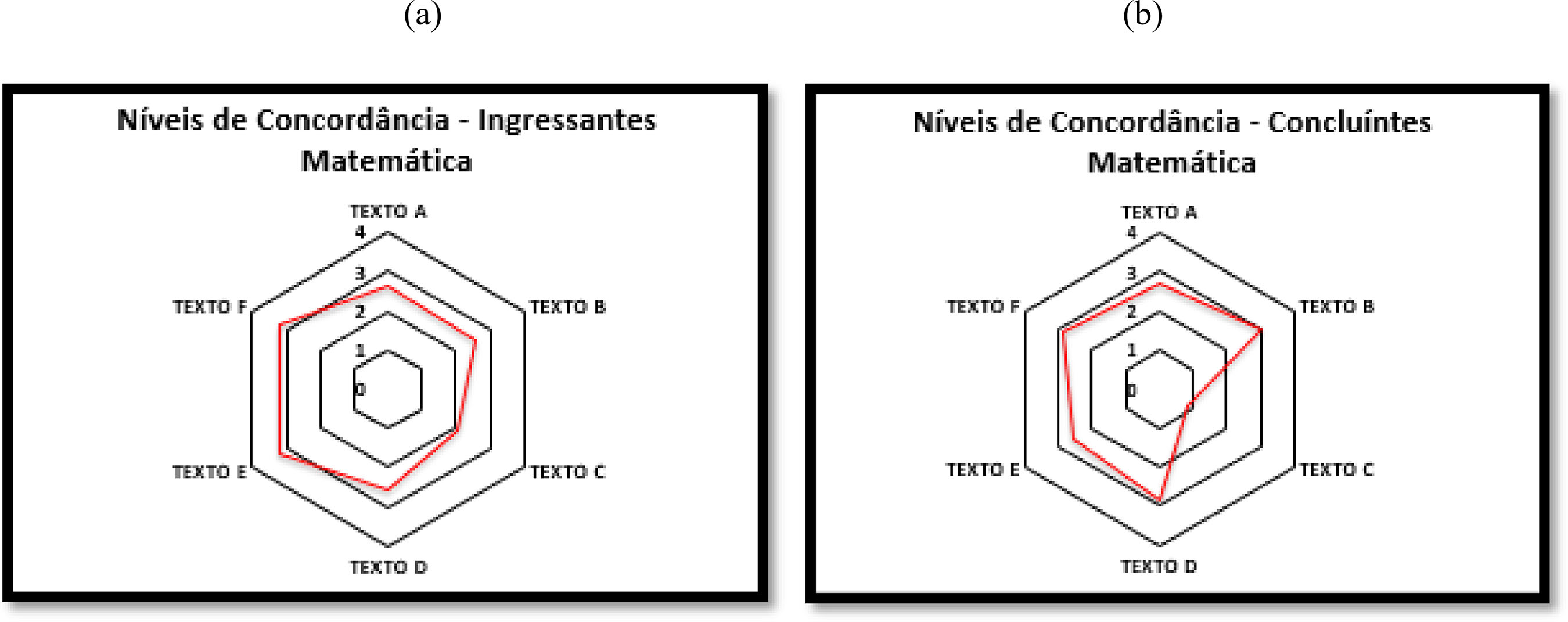 Os(As) discentes ingressantes do curso de Licenciatura em Matemática (Gráfico 2a), exibiram, entre os demais cursos, a maior média de discordância com texto “A”. Quanto aos(às) alunos(as) concluintes de Matemática (Gráfico 2b), avaliou-se pouca variabilidade na média de aceitação da correspondente visão empírico-indutivista da Ciência averiguada no texto “A”. Devido a isto, os(as) estudantes concluintes do curso de Licenciatura em Matemática foram englobados(as) na categoria (1). Vale ressaltar, ainda, que a média de concordância desses(as) participantes com o texto “A” pode fornecer indicativos de que eles(as) talvez tenham considerado como fator de maior relevância a “verificação” na ou da Ciência, pois, por meio dela, seria possível justificar a “verdade” ou pelo menos a probabilidade das teorias (Bacon, 1999).