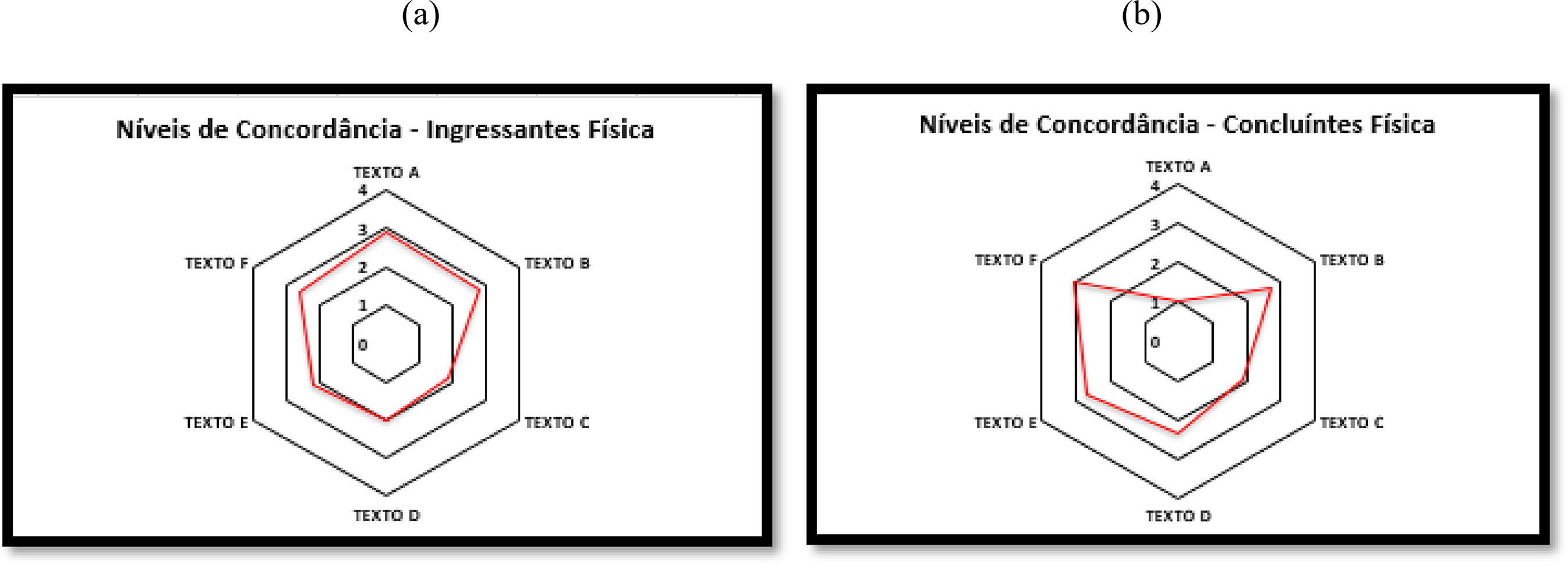 Quanto ao texto “C”, ponderou-se que os(as) concluintes do curso de Física exibiram a maior média de concordância em relação aos demais cursos. Verificou-se, ainda, uma incolumidade na média de aceitação da visão anárquica da Ciência, que pode ser mensurada a partir do parâmetro entre as percepções iniciais e finais dos(as) discentes ingressantes (Gráfico 3a) e concluintes (Gráfico 3b) de Física sobre a construção da natureza do conhecimento científico. Este fato caracterizou os(as) futuros(as) docentes do curso de Licenciatura em Física na categoria (2).