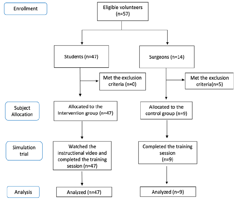 Forty-seven students and nine surgeons completed the study without losses or missing data. The study flow diagram is shown in Figure 1.