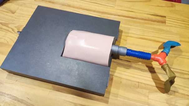 The simulator was designed to mimic the structures of the anterior human neck and the airway involved in the performance of the cricothyrotomy: skin, thyroid, and cricoid cartilages, cricothyroid ligament, trachea, main bronchi, and lungs. The cartilages were sculpted in epoxy resin over a corrugated plastic electrical conduit simulating the trachea. A replaceable kinesiology tape covered a 1 cm hole between the thyroid and cricoid components, simulating the cricothyroid ligament. Garden hose Y-shaped accessories adapted to the distal part of the trachea component simulated the main bronchi, and rubber balloons adapted to the bronchi component simulated the lungs. The assembled components were embedded into a high-density foam piece with rounded contours simulating the anterior face of a human neck. The simulator was covered with an artificial skin made of a tulle mesh embedded in skin-color silicone resin. The set was attached to a base made of two medium-density fiberboard (MDF) boards with hinges at one end, allowing the replacement of the cricothyroid ligament component and the skin incision site between attempts. The construction cost of the simulator was estimated by summing the acquisition prices of the simulator components.
