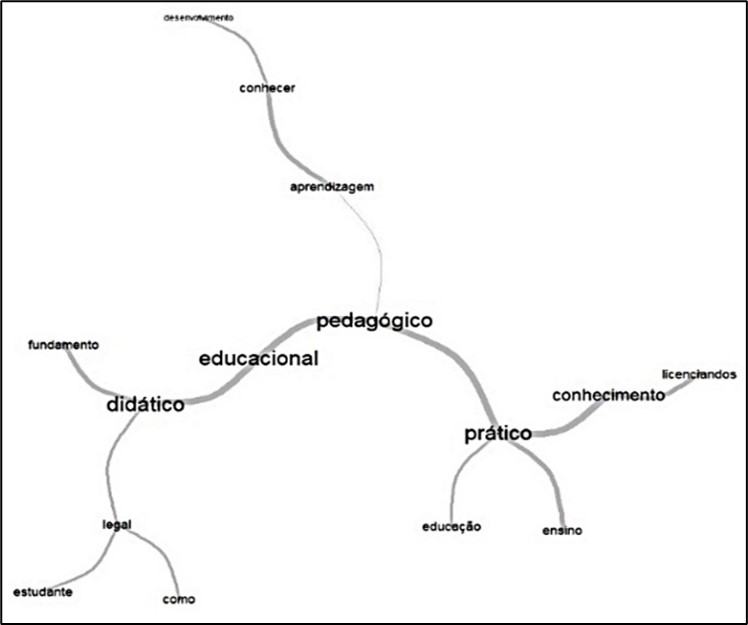 O gráfico revela a conexão semântica das palavras no documento, uma vez que estão interligadas pelo mesmo galho. Delas se ramificam outros termos que são significativos, tais como Conteúdo, Ensino, Habilidade, Interdisciplinar, Didático e Desenvolvimento (Figura 3). Pode-se inferir a presença do Conhecimento Pedagógico de Conteúdo, visto que “[...] inclui compreensão do que significa ensinar um tópico de uma disciplina específica assim como princípios e técnicas que são necessários para tal ensino” (Mizukami, 2004, p. 39).