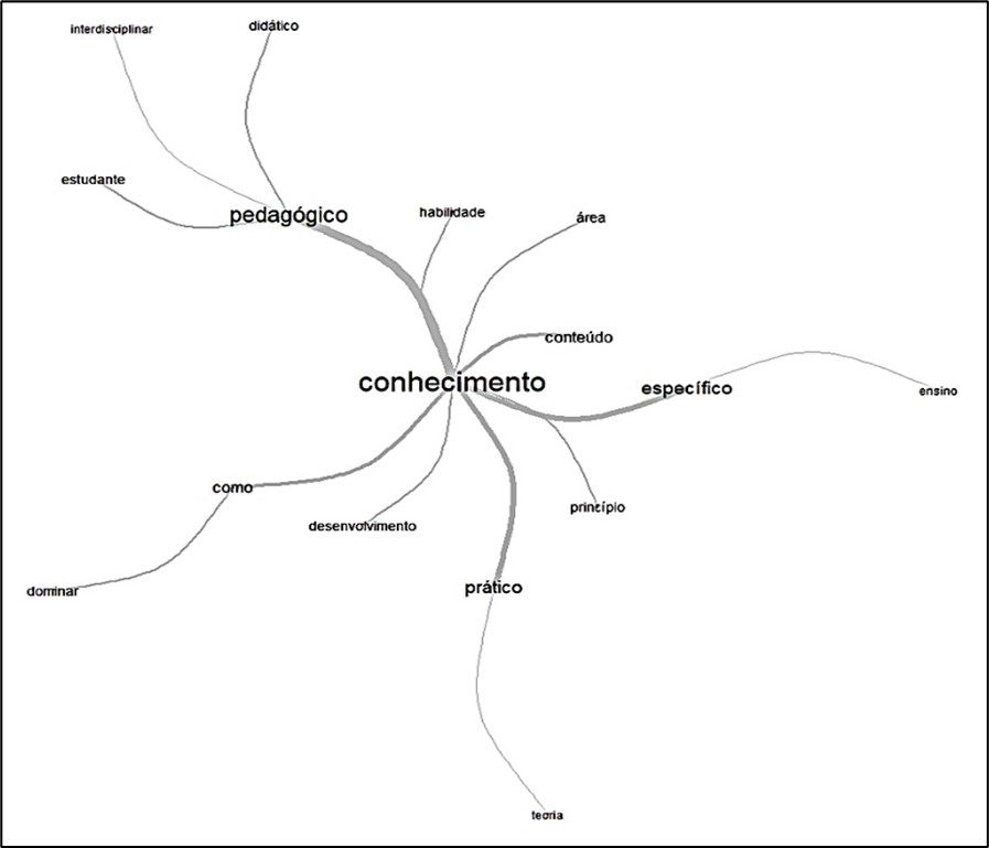 A partir do Quadro 3, identifica-se o Conhecimento Pedagógico de Conteúdo em todas as legislações, uma vez que se observam a articulação entre teorias educacionais e prática docente, o uso de diversas abordagens teórico-metodológicas, princípios educacionais e interdisciplinaridade. Os trechos foram analisados por um gráfico de similitude que destacou quatro palavras, Conhecimento, Pedagógico, Específico e Prático (Figura 3).
