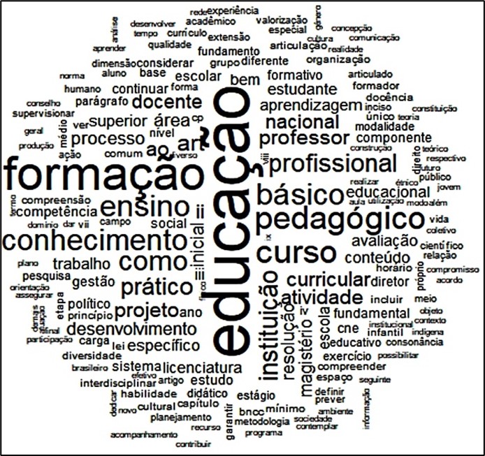 Desse modo, constata-se, na Figura 4, que o termo educação é o destaque, aparecendo 307 vezes. Outras ocorrências são: formação (n=218), curso (n=141), pedagógico (n=138), básico (n=123), ensino (n=123), conhecimento (n=117), instituição (n=102) e profissional (n=99). Essas são as palavras com maior frequência, evidenciando, assim, os temas ou tópicos destacados por essas leis que visam formar professores. Outro dado relevante é que os termos tecnologia (n=10), tecnológico (n=7), TIC (n=3) e informação (n=12) pouco aparecem na nuvem. Quanto à articulação, observa-se que os termos como estágio (n=19), articulado (n=18) e articulação (n=21) possuem baixa frequência no corpus textual.