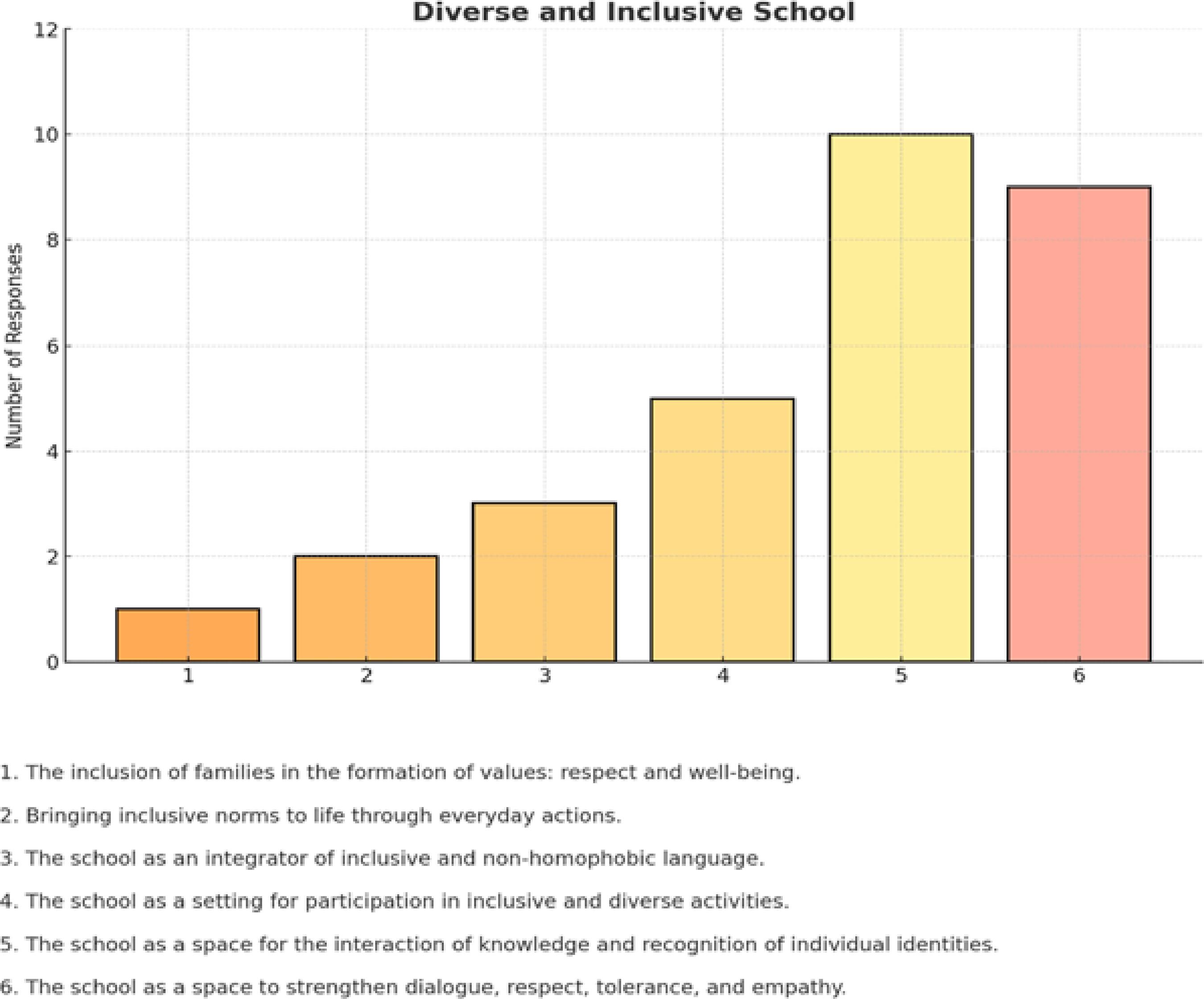 One of the central activities carried out as a concrete expression and application of all the discussions and learning related to the GP—led by the students of the gender school and the teachers leading the initiative—was a pedagogical session on GP with the entire institution, held on August 23, 2022. Group directors, teachers, and students participated in this session. It was structured around a guide prepared by the gender school and the female leaders interested in identifying key aspects of gender-related issues at the institutional level. In the workshop, participants were asked to reflect on the school environment and the expression of diverse identities in a safe space. The question posed was: "In your role within the academic community, how can you contribute to making the school a space of diverse and inclusive coexistence?" The responses from each group were categorized into six proposals based on priority and relevance, with the aim of incorporating them into the review of the Code of Conduct (see Graph 1).