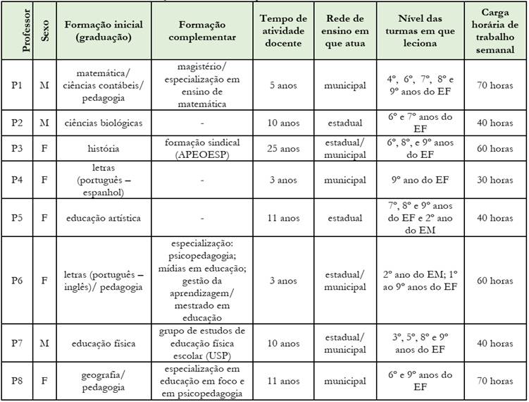 Os professores estão nomeados pela letra P, seguidos por números de 1 a 8 (P1, P2, P3, P4, P5, P6, P7 e P8), sendo os respectivos números atribuídos conforme a sequência em que as entrevistas foram efetivadas. Fizeram parte desse estudo cinco docentes do sexo feminino (P3, P4, P5, P6 e P8) e três do sexo masculino (P1, P2 e P7). Todos os participantes dessa pesquisa são professores efetivos na rede estadual e/ou na rede municipal de São Paulo. Com exceção do P2, da P4 e da P5, que não acumulam cargos, os demais docentes possuem uma dupla jornada de trabalho entre a rede estadual e a rede municipal de São Paulo ou com outra rede.