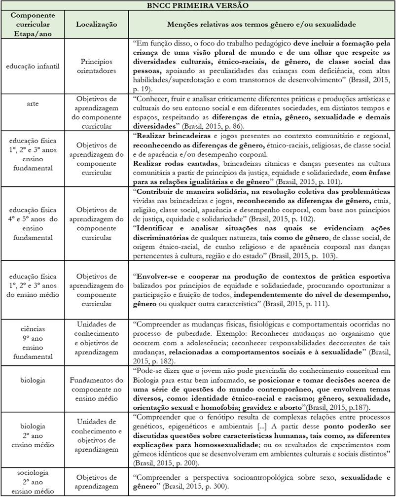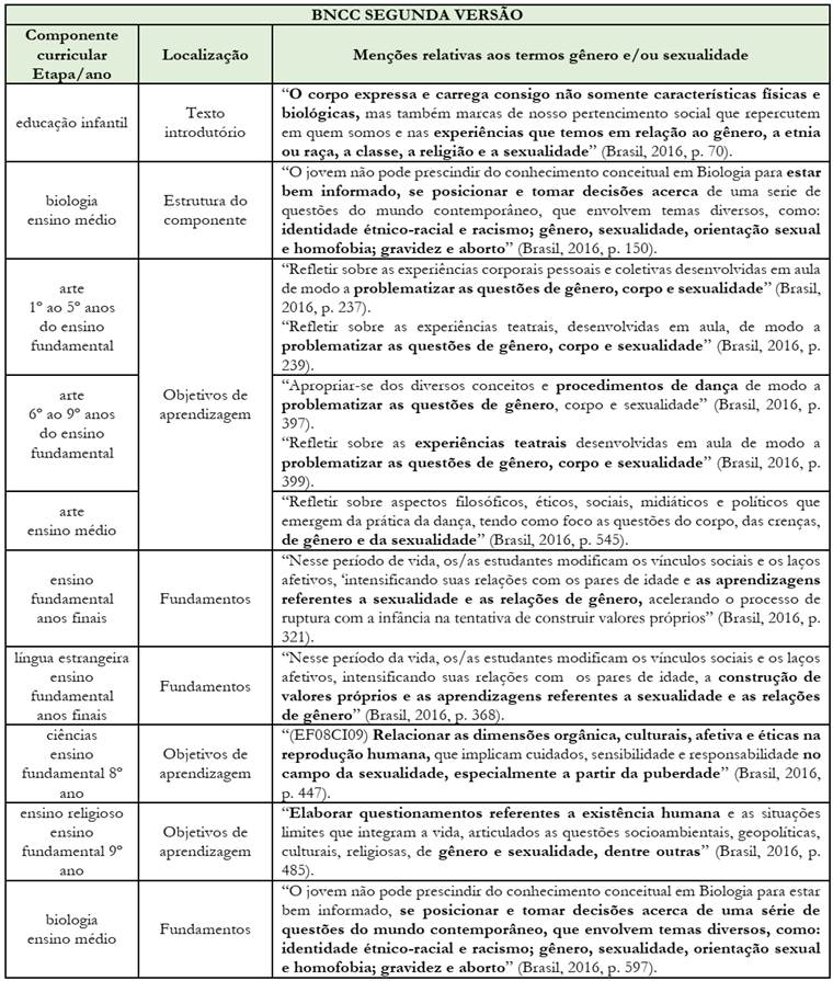 No tocante à sexualidade e às questões de gênero, a primeira versão da BNCC vislumbrava a possibilidade de abordar essas temáticas em diversas etapas e áreas do conhecimento. Conforme se verifica no Quadro 2, termos equivalentes a tais temáticas são amplamente difundidos em diversas passagens do documento:
