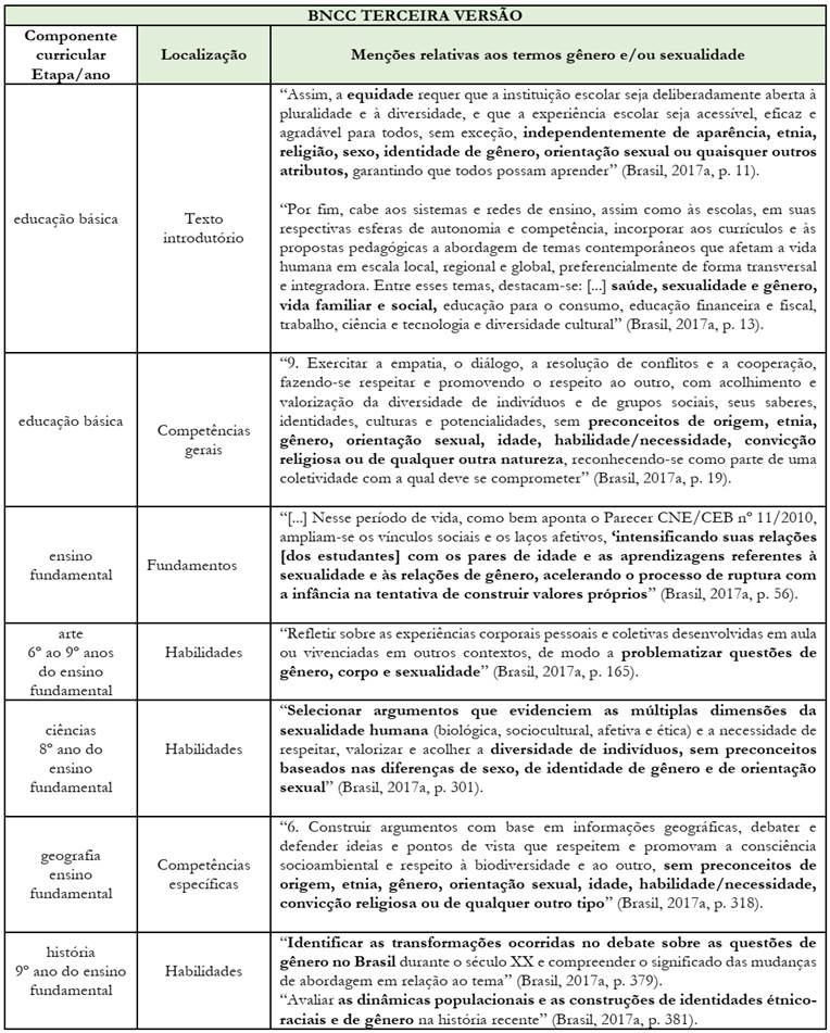 O exame das diferentes versões da BNCC revelou que da primeira para a terceira versão houve mudanças significativas na abordagem das questões de gênero e sexualidade em todas as etapas da educação básica. De modo geral, havia não somente menções aos termos ora suprimidos na versão oficial como também uma visão mais crítica e reflexiva sobre a diversidade sexual.