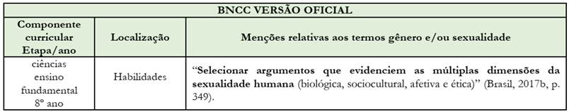 Conforme se verifica no Quadro 5, na versão da oficial da BNCC, a menção explícita da temática sexualidade sobrevém muito timidamente apenas no componente de ciências e restrita ao contexto do oitavo ano do ensino fundamental: