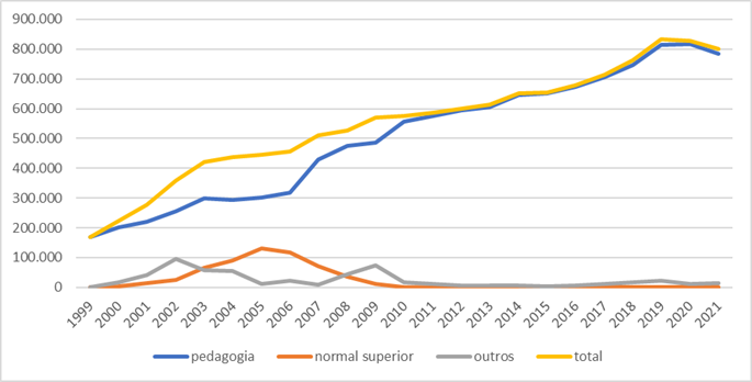 Figura 1 Evolução de matrículas em cursos de Pedagogia, Normal Superior e outros cursos de formação de professor dos anos iniciais da Educação Básica (1999-2021)