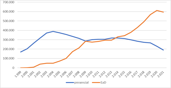 Figura 3 Número de matrículas em cursos de Pedagogia por modalidade de ensino (1999-2021)