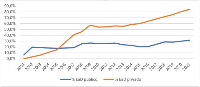 Figura 4 Percentual de matrículas em EaD no curso de Pedagogia em IES públicas e privadas (2001-2021)