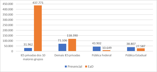 Ao observarmos esses números, podemos constatar que apenas 15,4% dos estudantes matriculados em 2021 estavam em cursos das IES públicas federais e estaduais (presencial e EaD), e que 70,8% de todos os estudantes de Pedagogia estavam cursando o EaD de IES privadas, a grande maioria (78,7%), 437 mil estudantes, em IES pertencentes a dez grandes grupos, o que aponta o caráter centralizador desse movimento nessas instituições.
