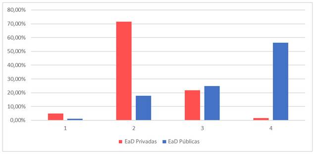 Além disso, não se trata de uma oposição entre presencial e EaD, como se as IES privadas fossem piores do que as públicas porque as primeiras oferecem cursos a distância enquanto as últimas oferecem cursos presenciais. Quando comparamos apenas os concluintes dos cursos de Pedagogia a distância entre IES públicas e privadas, fica clara a diferença entre as instituições, como evidenciado na Figura 7 que traz o percentual dos concluintes de Pedagogia EaD das IES públicas e privadas como função do conceito Enade do curso.