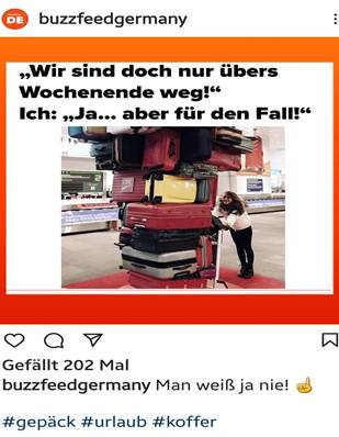 In the example above, "Wir sind doch nur übers Wochenende weg"2 the MP doch presents its usual function of contradiction, the adversity can be understood by the relation between the utterance and the context presented by the image. The speaker chooses to use the MP doch to suggest a contradiction between the pragmatic pretext (the image with a woman with a huge pile of suitcases) and the situation presented in the utterance (they are going for a weekend trip). Thus, the speaker shows to his/hers interlocutor the need to take something into account, in this example, that for a trip of just a few days you don't need as much luggage.