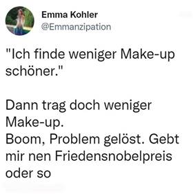 In this next exemple, someone says they think it's prettier when people wear less makeup (Ich finde weniger Make-up schöner). To demonstrate the adversity of this statement, the speaker responds using the MP doch: "Dann trag doch weniger Make-up".3 The MP doch is used here to indicate a contradiction through irony, that is, if you don't think a lot of makeup is beautiful, then simply don't use it - and stop criticizing other people. The nuclear function of doch is , therefore, preserved in this example, and what changes is the pragmatic meaning, in this case (image 2) an ironic confrontation and in the former example (image 1) a suggestion or advice.