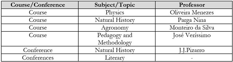 In Box 1, we see different types of courses and conferences presented to the public, pointing out some examples of approaches to themes in such events to have an overview of the training processes through such classes. In his inaugural lecture, professor José Veríssimo proposed a discussion on the importance of Pedagogy, seeking to present the problems of education and its methods (REVISTA PEDAGOGICA, 1895, no. 44, pp. 139-140). The public lecture given by J.J. Pizarro, on June 8, 1895, entitled “The voice of the word from the point of view of language”, addressed the functioning of the voice and the development of language in the human species in different people (REVISTA PEDAGOGICA, 1895, no. 45, p. 194).