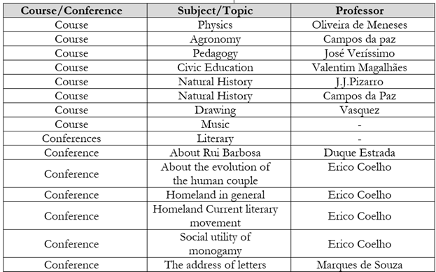 5The newspapers of the city of Rio de Janeiro used to publish the days and times of the courses offered by Pedagogium and their respective teachers. Those that most cited such information were: O jornal do Comércio; Gazeta de Notícias; Jornal do Brasil; A Imprensa; A notícia; O Paíz.