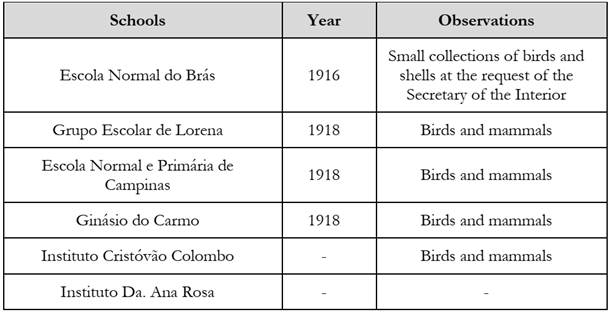 The relationship established between school museums and the teaching of natural sciences becomes clear in the case of the state of São Paulo, due to the debate over the founding of the Museu Paulista and its role in the São Paulo education project. The Museu Paulista was conceived as a scientific institute and its functions included providing objects and collections to educational institutions. However, it was not possible to meet all existing demand due to problems that directly affected the maintenance of the museum's collections, due to the lack of professionals and the difficulty in obtaining pieces.