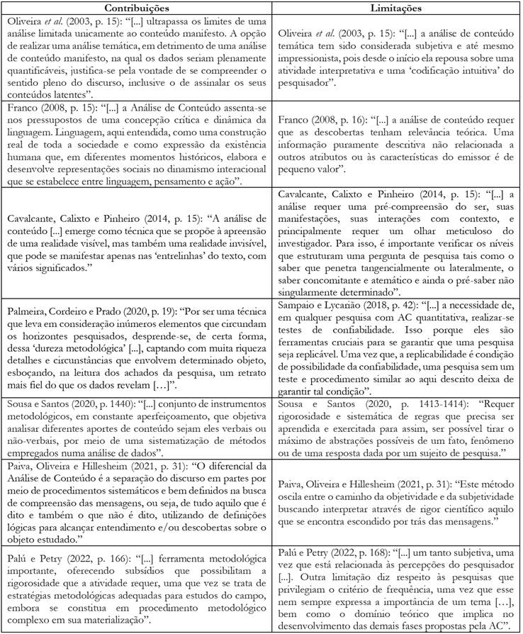 Vislumbram-se, no Quadro 1, alguns dados que corroboram e indicam as contribuições e limitações do uso da AC para análise de dados em pesquisas qualitativas. Nota-se que o reconhecimento da rigorosidade no processo sistemático e analítico constitui-se em um argumento que advoga a favor do método que, justamente pela capacidade de interpretação, é capaz de descortinar cenários e apresentar elementos que não são identificados apenas pela prática interpretativa.