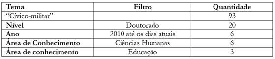 Escolhemos o termo “cívico-militar” para capturarmos teses e dissertações que abordassem o tema e filtramos pelo nível de doutorado para analisarmos pesquisas mais aprofundadas, que contribuíssem com nossa pesquisa. Posteriormente, filtramos teses que se localizassem no intervalo de 2010 até o ano atual, pois, como o Programa Escola Cívico-Militar foi implantado em 2019, nosso objetivo era analisar se já havia, na academia, problematizações, ou abordagens mais significativas sobre a atualização do militarismo na Educação Básica. Os filtros referentes a Ciências Humanas e Educação ofereceram foco mais específico em pesquisas nessas áreas do conhecimento.