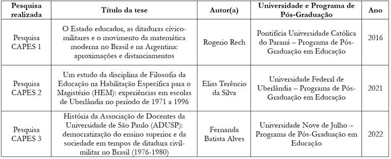 É notório, a partir do quadro apresentado, que o tema cívico-militar é bastante abordado em pesquisas na atualidade; mesmo assim, algumas delas não contribuíram com nossa problemática por relacionarem-se a outros eixos e áreas de conhecimento e terem outros referenciais. Assim, optamos por selecionar pesquisas que tivessem sido elaboradas em escolas, na perspectiva pós-estruturalista (a fim de estabelecerem diálogo com nosso referencial) e/ou que relacionassem o termo “cívico-militar” à educação. Salientamos que, nesses filtros, encontramos apenas uma pesquisa que abordava o novo Programa Cívico-Militar. Dessa forma, exploramos a pesquisa e verificamos algumas outras que também tematizavam a militarização da educação. A partir de nossas discussões, dialogamos com as teses selecionadas, que totalizaram três, e as apresentamos nos quadros a seguir, com o título de cada uma, a identificação dos autores e da Universidade em que foi realizada a pesquisa, bem como o ano em que foi defendida.