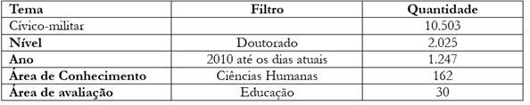 O filtro cívico-militar, empregado sem aspas, foi escolhido para encontrarmos mais discussões sobre a intersecção dos termos (cívico e militar). Como nível, escolhemos “tese de doutorado” para catalogarmos pesquisas com maior aprofundamento teórico-metodológico. Além disso, estipulamos um recorte temporal a partir do ano de 2010, a fim de capturarmos as pesquisas atuais, com discursos que permeassem o cenário contemporâneo, que deu condição de possibilidade à instauração do PECIM. Selecionamos Ciências Humanas e Educação como áreas de conhecimento e de avaliação, respectivamente, pois nossa pesquisa é voltada a essas áreas. O filtro apresentou 30 teses como resultado.