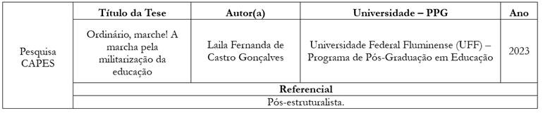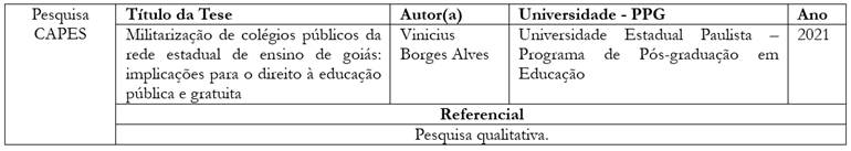 Desenvolvemos, aqui, a revisão da literatura da tese que encontramos no campo Pesquisa CAPES 2, que aborda o tema “cívico-militar” e volta-se a escolas. As Pesquisas CAPES 1 e CAPES 2 não compuseram a revisão de literatura pelos seguintes motivos: não apresentam cunho pós-estruturalista, não abordam escola cívico-militar e não fazem referência a períodos de descontinuidades históricas relevantes para a pesquisa.