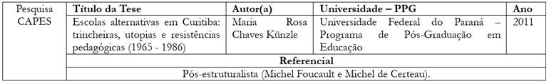 O objetivo da próxima tese aqui abordada, encontrada por meio da Pesquisa CAPES 5, foi estudar quatro escolas que funcionaram em Curitiba entre 1965 e 1986, anos que correspondem à fundação da primeira e ao fechamento da última delas. Essas escolas são definidas, pela literatura educacional, como “Escolas Alternativas”, conjunto de instituições que estabeleceram diferentes críticas às escolas convencionais, não só no Brasil como em várias partes do mundo. Muitos dos idealizadores e fundadores dessas escolas enfrentaram o regime militar, sendo que alguns foram perseguidos e presos, e algumas escolas sofreram investigações e intervenções da polícia. O quadro a seguir apresenta os dados da tese em questão.