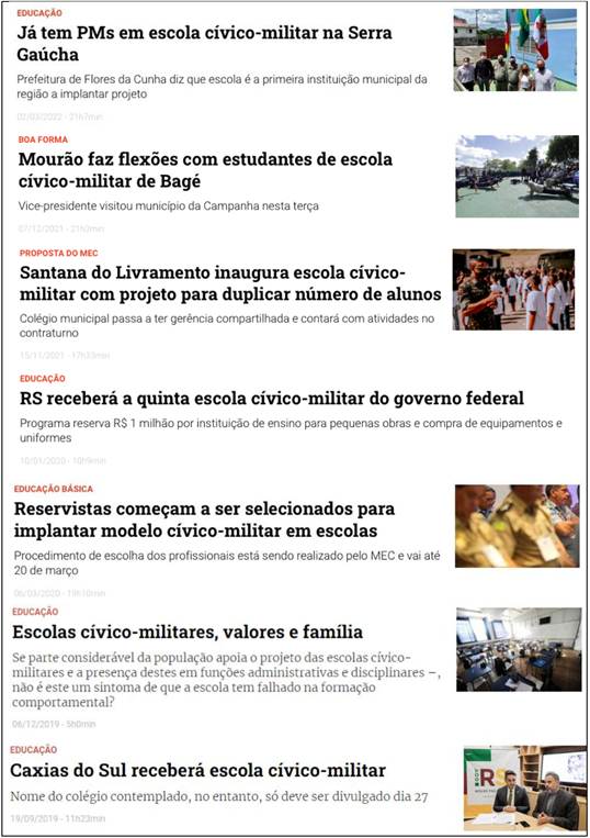 A emergência deste estudo se dá no contexto do cenário atual brasileiro, quando estava vigente a proposta de instituir-se o “Programa Nacional das Escolas Cívico-Militares (PECIM)” nas escolas públicas (Portaria n. 1.071, de 24 de dezembro de 2020), em cuja base está o discurso de que o militarismo é um “reforço” educacional. Na figura 1, acima, apresentamos algumas das manchetes de reportagens que aparecem em uma pesquisa que realizamos no site Gaúcha Zero Hora (GZH), utilizando a palavra-chave “cívico-militar”. Percebemos que as reportagens funcionam como operadoras e proliferadoras discursivas, legitimando a emergência do referido programa.