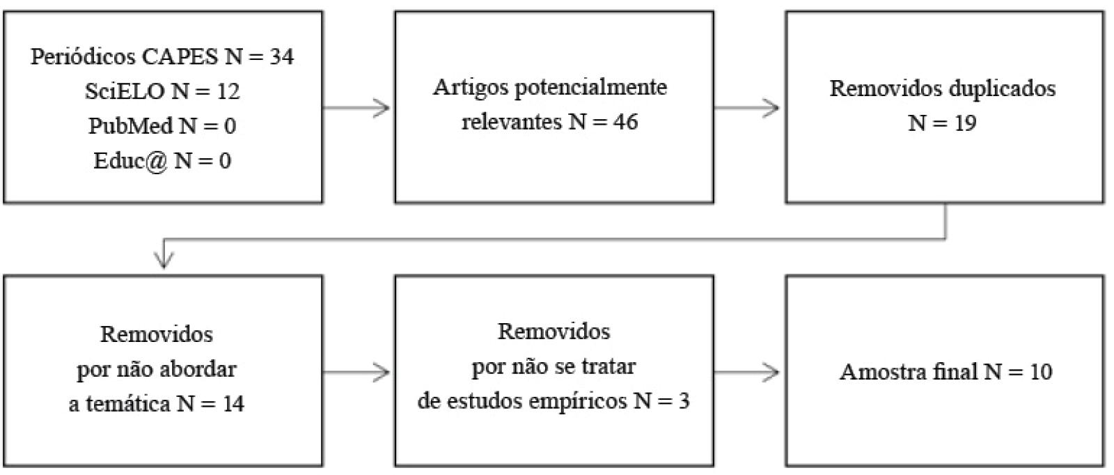 Nota de acessibilidade: Fluxograma composto por seis caixas de texto retangulares conectadas por setas, distribuídas horizontalmente em duas linhas. Apresenta o processo de seleção de estudos, detalhando as etapas de identificação, seleção e filtragem dos artigos. A pesquisa inicial resultou em 34 artigos da base Periódicos CAPES, 12 da SciELO, zero de PubMed e Educa. Na sequência, foram identificados 46 artigos potencialmente relevantes e removidos 19 artigos duplicados. Na fase de filtragem por relevância, 14 artigos foram excluídos por não abordarem a temática de interesse e três por não se tratar de estudos empíricos. Por fim, a amostra final incluiu dez artigos.