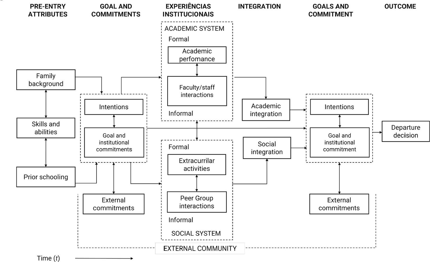 In his thesis, Lima Júnior (2013) compares Tinto to Bernard Lahire and Pierre Bourdieu. For him, SIT seeks the meaning of students’ actions in their academic daily lives and its measurement is given by the beliefs and actions that go beyond their position in the social structure and the capital they possess. At university, students acquire dispositions that can contribute to their permanence or not. Based on this, Barreiros (2017) states that Tinto recognizes the individual as being endowed with group, institutional and field experiences that are distinct and a consequence of living in society, approaching Lahire.