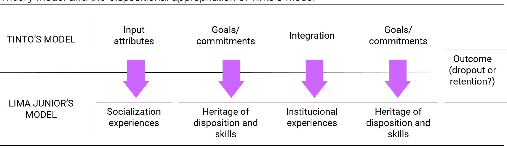 Figure 2 Comparative diagram, proposed by Lima Júnior, between Vincent Tinto’s Student Integration Theory model and the dispositional appropriation of Tinto’s model