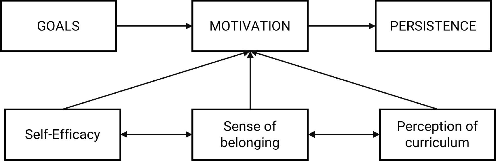 According to Tinto (2017), the impact that student experiences have on motivation can be an unfolding of the interaction of individual goals, self-efficacy, sense of belonging, and the importance given to the curriculum by students. Based on this finding, it is possible to represent the motivation and persistence model through a flow diagram (Figure 4) that represents the influence exerted by self-efficacy, sense of belonging, and curricular perception on motivation, producing persistence. It is important to remember that the starting point of the model are the goals set before and during the course.