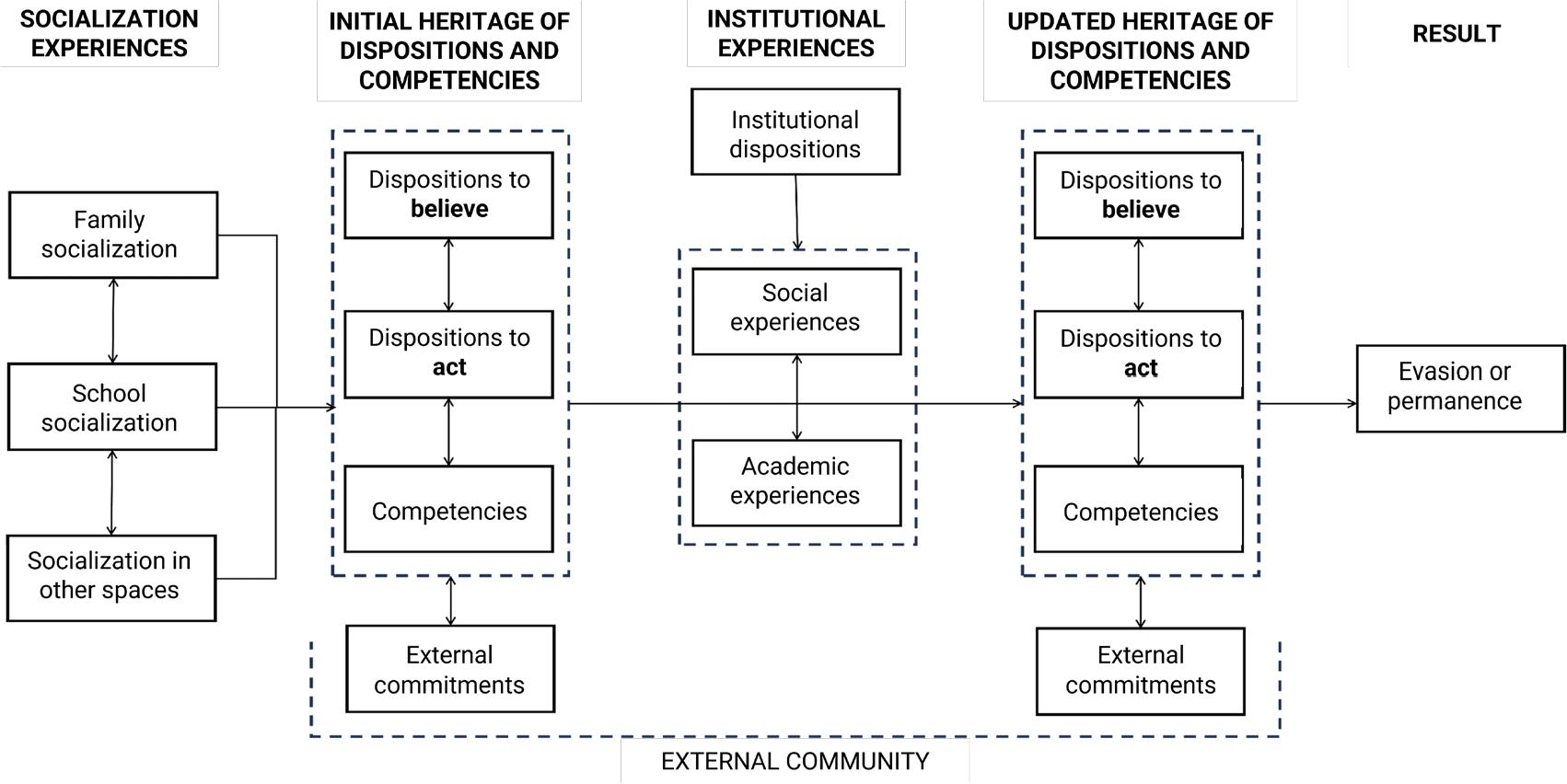 Lima Júnior’s (2013) proposal focuses on the interaction between students and institutions. In undergraduate studies, the set of dispositions and skills of students changes according to their experiences inside and outside the classroom. The interaction between the set of skills and dispositions and institutional dispositions shows the institutional causes of dropout. This representation of the SIT seeks to understand how students act and, at the same time, shows the dispositions present in the university routine that facilitate dropping out of the course. The diagram made by Lima Júnior (2013) is shown in Figure 3.