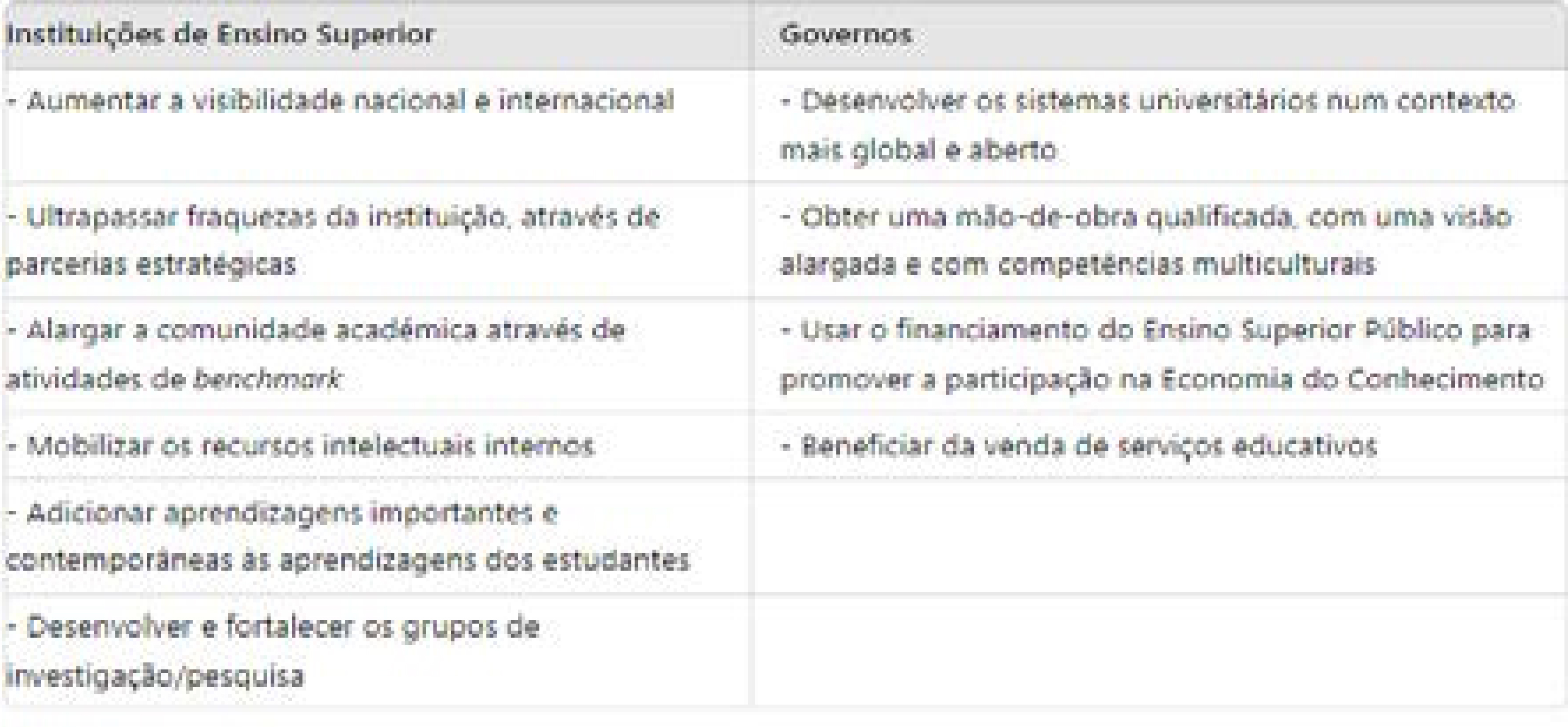 A OECD (Organisation for Economic Co-operation and Development), em seu relatório "Approaches to Internationalisation and Their Implications for Strategic Management and Institutional Practice" (2012), identifica cinco principais razões para a internacionalização das IES: 1) melhorar a preparação do aluno; 2) internacionalizar o currículo; 3) melhorar o perfil internacional da instituição; 4) fortalecer a pesquisa e a produção de conhecimento; e 5) diversificar o corpo docente e funcional. A internacionalização prepara os alunos para um mercado de trabalho globalizado, desenvolvendo competências interculturais e uma compreensão mais ampla do mundo. A inclusão de perspectivas internacionais nos currículos amplia o alcance do ensino, tornando-o mais relevante e atual. Instituições internacionalizadas atraem maior reconhecimento global, fortalecendo sua reputação e competitividade. A colaboração internacional em pesquisa aumenta a qualidade e a inovação, promovendo a produção de conhecimento de ponta. A diversidade cultural e profissional entre docentes e funcionários enriquece o ambiente acadêmico e administrativo (Lauxen; Marcelino; Cerdeira, 2024), o que corrobora o quadro produzido por Cerdeira e Taylor (2019), das principais razões para a internacionalização: