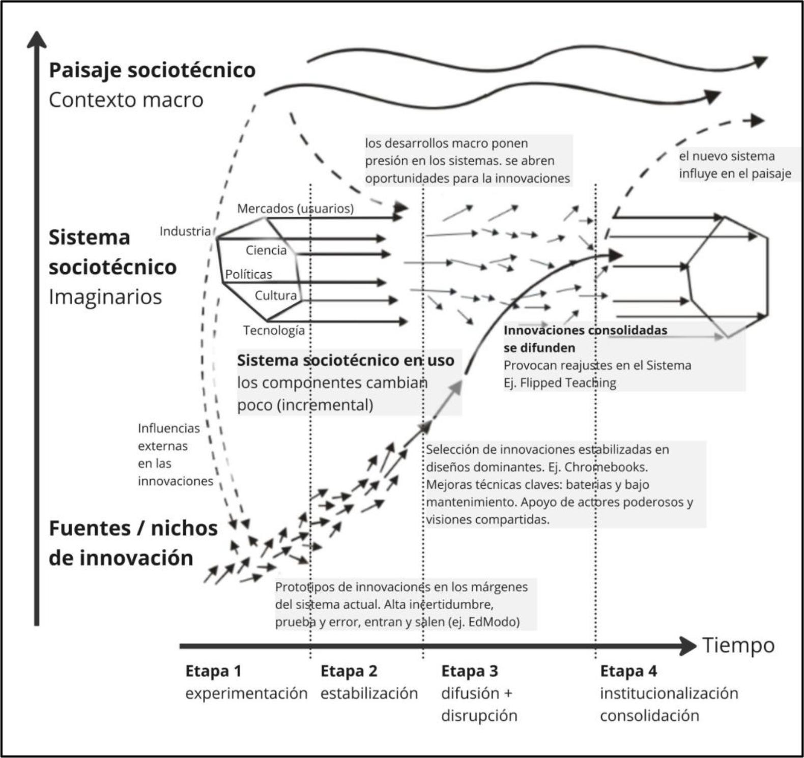 Los sistemas sociotécnicos son mantenidos por regímenes con sus propias lógicas profesionales que coexisten, dialogan y luchan en cada transición de un sistema a otro. Implica decisiones y acciones que tienen lugar en los campos de la tecnología (diseño, producción), políticas educativas (política, regulación), investigación, campo sociocultural (imaginarios, política) y educación, tanto la docencia como directivos (uso, adopción, rechazo).