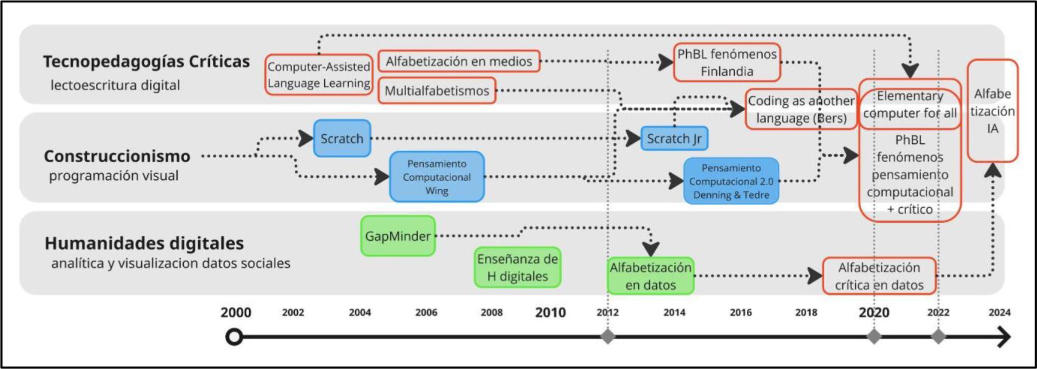 Los multialfabetismos de Cope y Kalantzis (2009) presentan un primer entrelazamiento entre la enseñanza de prácticas de lectura y escritura digital desde una perspectiva crítica con el pensamiento computacional y la lecto-escritura tradicional, es decir constructivista, incorporando el contexto social y cultural, por lo que consideramos diferentes formatos de alfabetización no sólo el lenguaje natural sino que además el computacional.