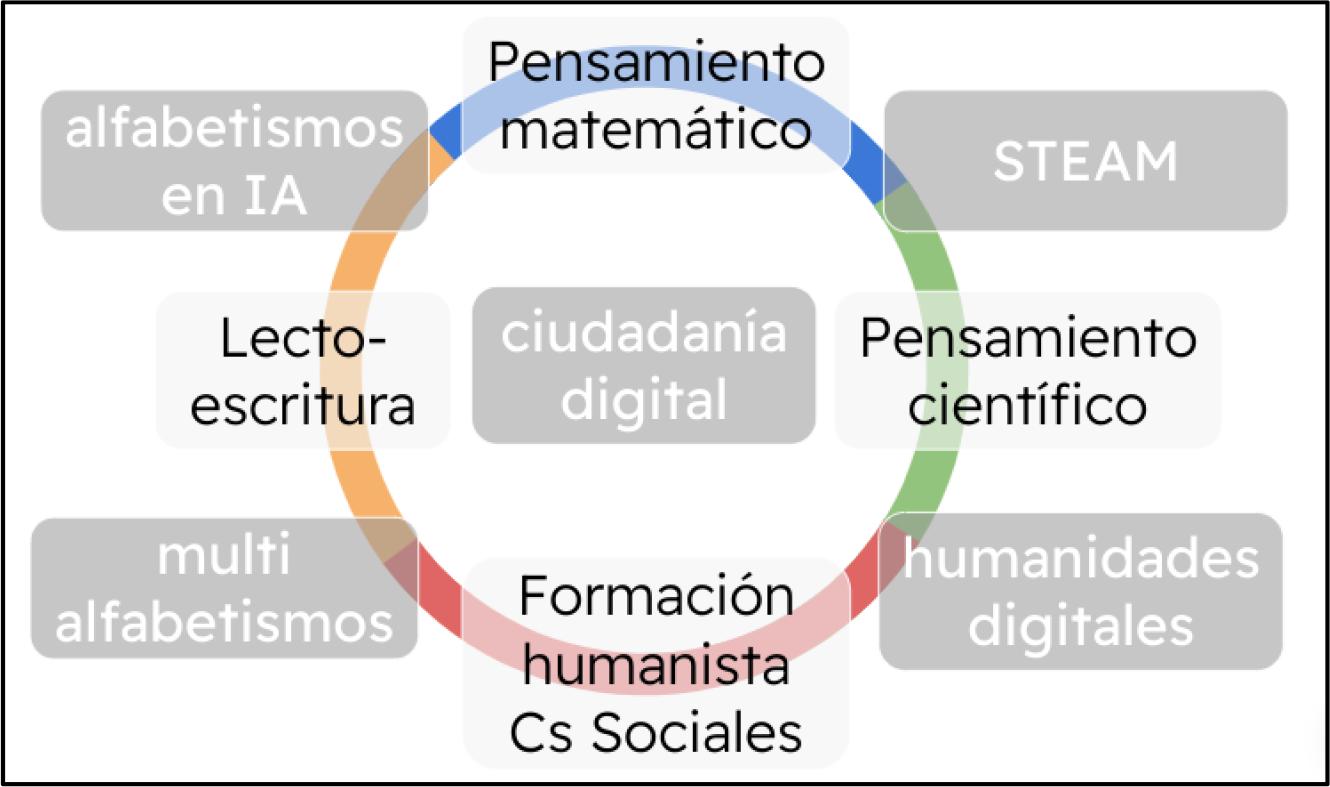 Ellos son el STEAM, las humanidades digitales, los multialfabetismos y el alfabetismo en IA. De este modo, al STEAM lo identificamos como el entrelazamiento del Pensamiento matemático, con el Pensamiento científico y el Pensamiento computacional (ampliamente abordado en la bibliografía no reviste mayor interés en este análisis). Solo se podría mencionar que aún en esta área hay oportunidades de cruce para la formación de la Ciudadanía Digital Crítica por ej. desarrollando proyectos de desarrollo de software para el diálogo social y el bien común (Lee et al., 2022).