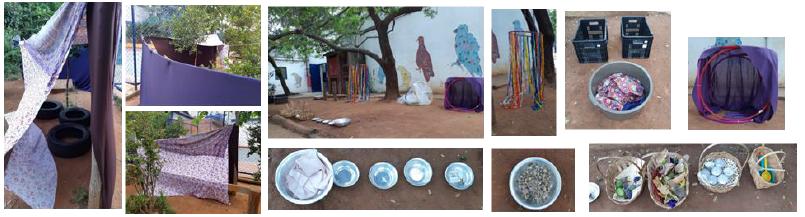 Figure 1 Backyard prepared by the researchers to set up the play environment, using basins, fabrics, huts, baskets with natural elements, pebbles, crates, and tires