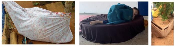 Figure 2 In the first image, four children built a hut that wrapped their bodies, closed in such a way that there are no doors or windows. In the second image, the fabric is used as a blanket by a child, who curls up like a baby. In the third image, the fabrics are used as “garment-houses,” but it is possible to see an opening to enter and exit