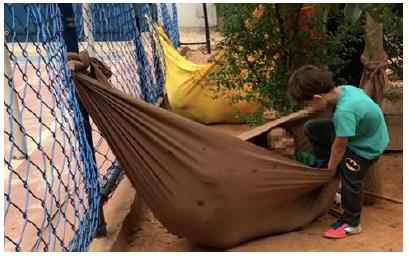 Figure 3 A boy moves the edges of a fabric to enter the garment-house created by two other children who are inside and allow him to enter