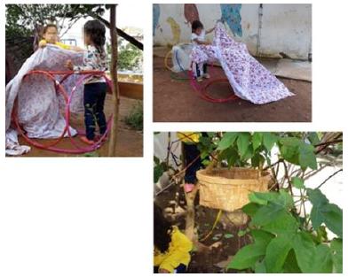 Sometimes, as soon as they had defined the places, they would get into action, developing the narratives together, speaking and acting as their characters. On other occasions, they spent almost all of their time decorating and compartmentalizing their “constructions” while they worked, telling each other what each compartment was for and redefining their roles and functions in the story. Depending on an object they held or a space they organized, they gave themselves a new function. For example, when organizing a big party for one of their peers, a girl, in possession of the large aluminum basin, exclaimed: “I was the one who was going to make the cake.” Or, in the context of a game of cabin in the woods, when a girl managed to tie a basket to the tree, she said to the other children: “This was the place where we kept everything we need.”