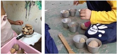 Organizing, decorating, and designating were practices that girls and boys set out to carry out, dedicating time and effort. Small pots, baskets, seeds, leaves, pebbles, and fabrics were organized and reorganized by them. During the games, they played, varying the content and container, by distributing and transposing small elements. In these situations, they tested sizes and fit, made one-to-one correspondences of terms, experimented with excess, sought new configurations, or returned to the initial one. The elements were moved, transposed, grouped, selected, and separated.