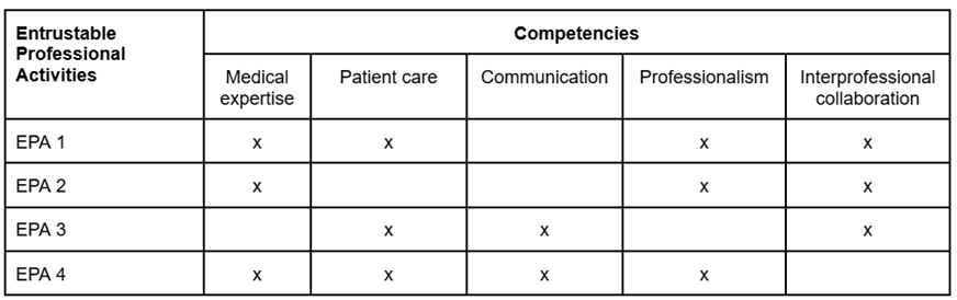 Entrustable Professional Activities and competencies are complementary and non-exclusive concepts. EPAs enable a practice-focused assessment of the resident’s acquisition of skills. The implementation of an EPA requires the recruitment of one or more of the competencies by the individual performing them. As an example, the hypothetical EPA “Perform anamnesis and physical examination” would recruit the competencies of medical expertise, patient care, communication, and professionalism11. And, therefore, the evaluation of this practical and observable activity would allow us to infer the individual’s acquisition of competencies5),(8.