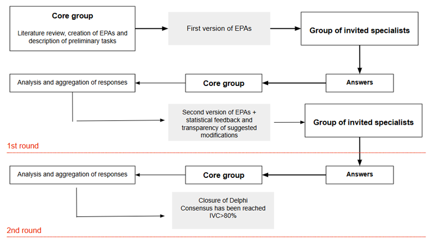It is recommended that each country develop its own Entrustable Professional Activities for residency, since local health contexts and needs vary17. The model proposed for this establishment involves the elaboration of an initial description of the EPAs by physicians of the specialty who have expertise in medical education and a subsequent validation, through consensus methodologies, by a larger group of physicians of the specialty10.