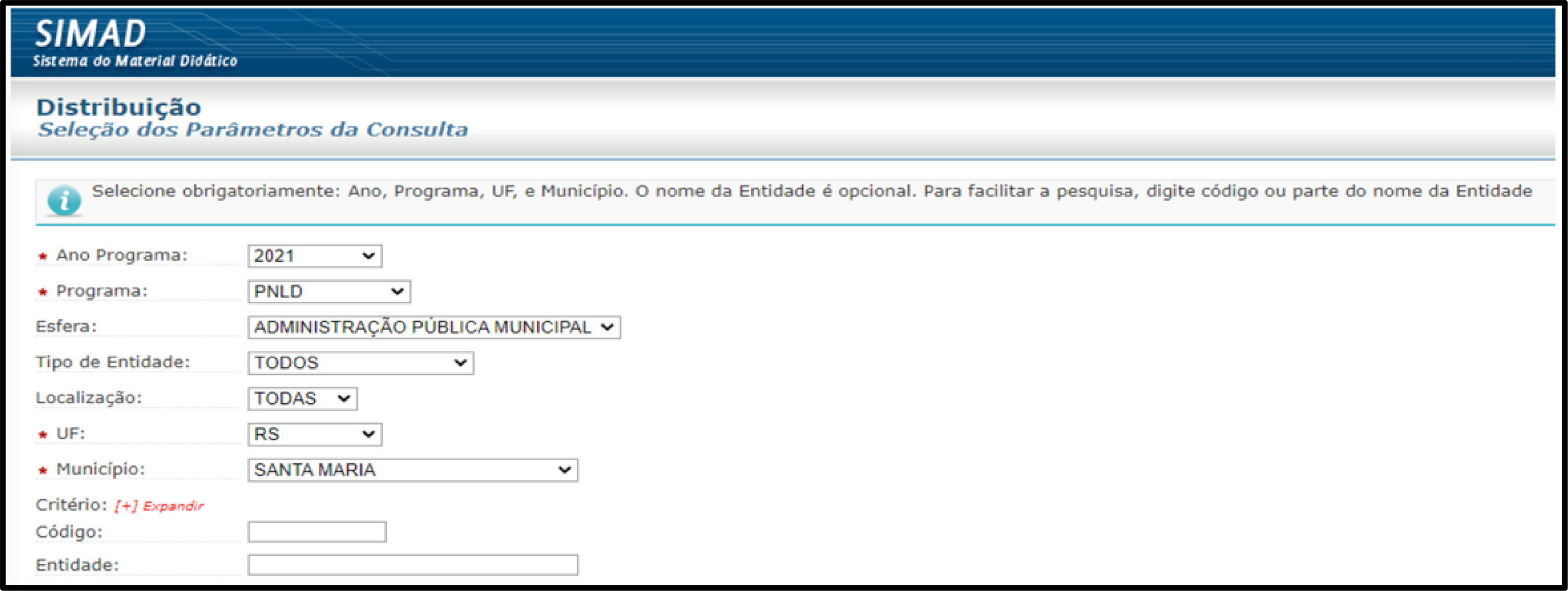Following the theoretical framework, this section outlines the methods for selecting the appropriate textbook and unit, and subsequently, the proposed adaptations for selected activities. The textbook selection was guided by two criteria, inspired by Cargnin, Rossi, and Ticks (2018, p. 562): 1) it had to be approved by PNLD in 2021; and 2) it should be the most widely adopted book for teaching English in the sixth grade of public schools in Santa Maria, RS. To identify the most commonly used textbook in Santa Maria, we accessed the SIMAD7 website and completed the provided form following the parameters in Image 1.