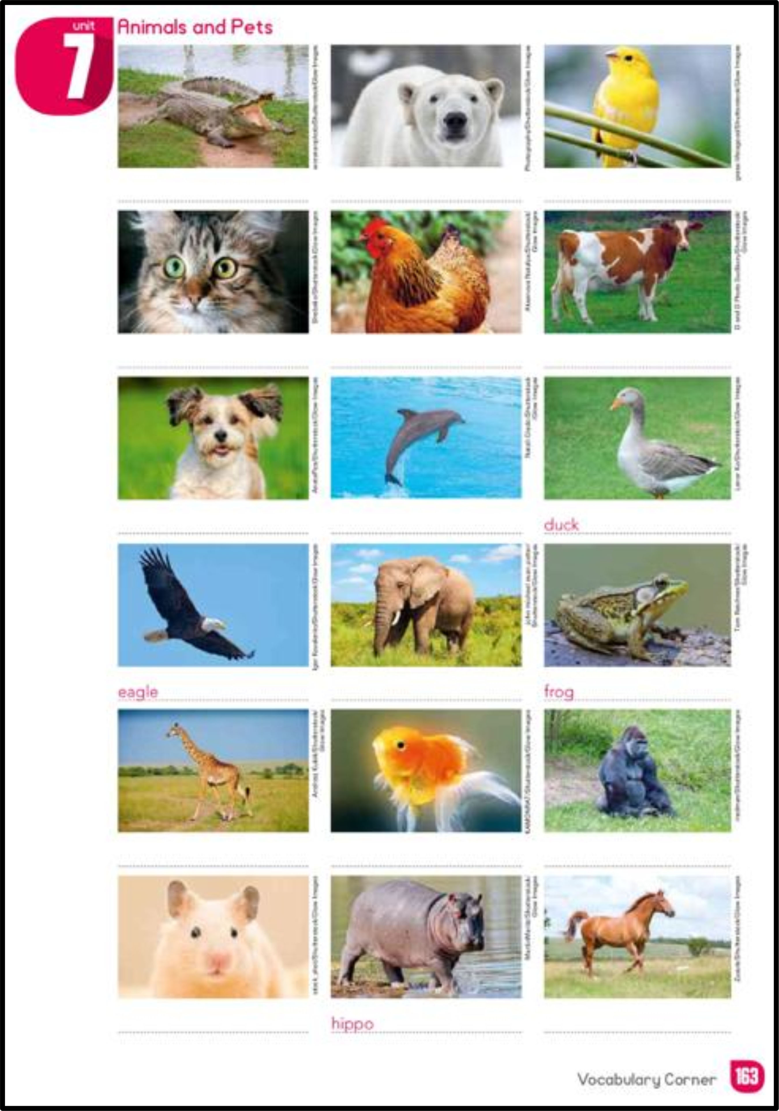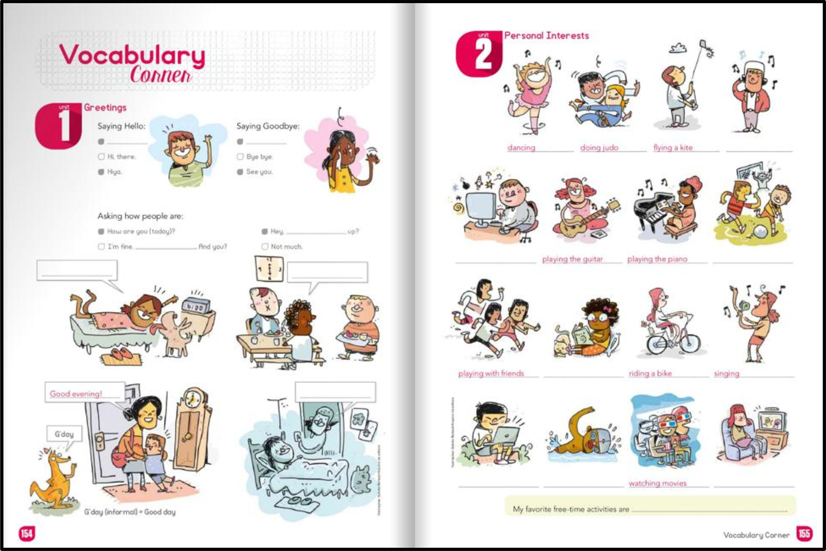 The "Vocabulary Corner" (pages 154 to 165) comprises 13 activities related to the vocabulary covered in all eight units of the textbook. As a result, the adapted material presented in this paper can be adopted throughout the entire year, offering a diverse range of activities. It is crucial to note that all activities in this section include visual elements such as pictures and drawings, without any provisions for visually impaired students. Image 3 displays two sample activities from units 1 and 2, respectively, illustrating the type of activities found in the Vocabulary Corner section. These activities will serve as a basis for our proposed adaptations to meet the needs of visually impaired students in English language learning.