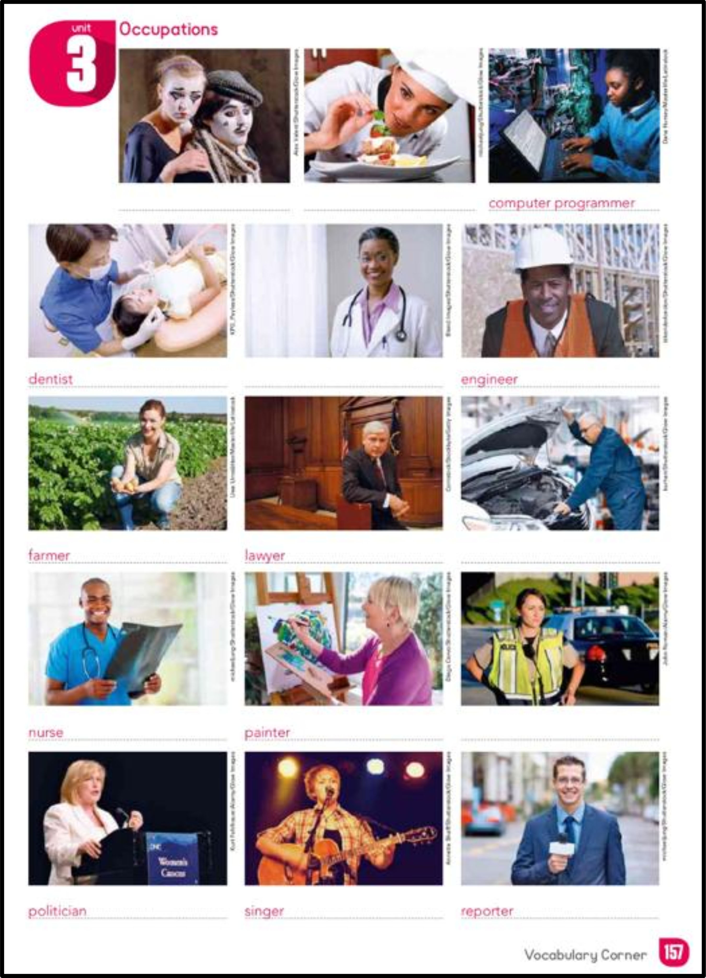 | 3 – Around the Globe | Occupations, months of the year, countries/nationalities - Verb to be (negative and interrogative forms) | Profiles, magazine cover, headlines, comic strip |