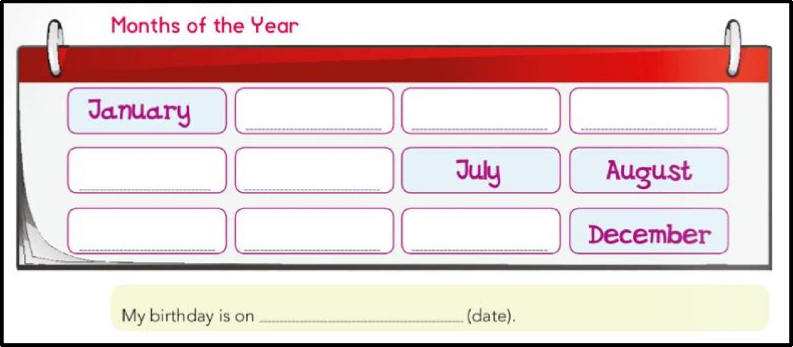 As for activity E, which involves the months of the year (as shown in Image 5), it can also be adapted to encourage group interaction. Instead of relying on visual elements, students can engage in a collaborative exercise where they explore the significance of each month and share personal anecdotes or experiences associated with them. For example, students can talk about special events, holidays, or memories related to different months. This activity not only reinforces language skills, but also allows students to connect emotionally and culturally, fostering a sense of inclusivity and understanding among all students.